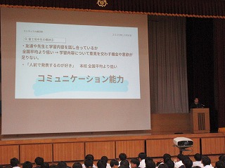 最初に、小松先生から本校の傾向として、コミュニケーション能力や自己肯定感、自己調整力に若干課題が見られ、それを伸ばすことによって学びが深まっていく可能性をお話ししていただきました。