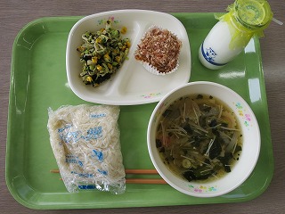 のり和えは、キャベツ、枝豆、コーン、もやし、刻み海苔、青海苔を、しょうゆとみりんで和えて作られました。2種類の海苔が良い味を出しており、野菜だけで食べるよりもアクセントの効いた食感を提供してくれました。