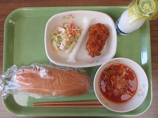 ミネストローネは、にんにく、じゃがいも、玉ねぎ、ベーコン、にんじん、キャベツ、大豆、オリーブ油、トマトケチャップ、スープストック、塩、こしょう、パセリなどが材料として使われました。トマトケチャップがよく効いており、味の濃いミネストローネを味わうことができました。