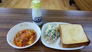 今日は、PTAの方々に給食を試食していただきました。そこで、子どもだけでなく大人にも人気のハニーレモントーストが出ました。厚切りの食パンに、ハチミツ、無塩バター、国産レモン汁などを混ぜて塗りました。パンの端までしっかりバターが塗られており、一枚一枚心を込めて手作りしてくれていることがわかりました。甘酸っぱさがパン全体に感じられ、幸福感を感じながら食べることができました。
