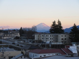 12月4日(木)夕方、職員室から生徒の下校の様子を見ていると・・・澄んだ空気の向こうに、ここ数日の新雪に夕日が当たって輝くきれいな富士山が目に入ってきました。これはシャッターチャンス!と思って・・・カメラを手に下校しようとして階段を降りてくる生徒たちとすれ違いながら「さようなら」の挨拶をしつつ階段を登っていくと・・・