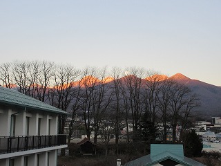 富士山を無事撮影したあと、3階の渡り廊下を歩いていると・・・今度は、八ヶ岳の絶景が目に飛び込んできました。蛇足だとは思いますが、一応説明すると・・・冠雪により白くなった頂に、夕日が当たって赤く染まっています。空は澄んだ青空、麓側はすでに日が沈んでいるので、そのコントラストも美しさをより引き出しています。