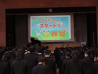 最初は全校で『だいじなもの』を合唱してスタートです。