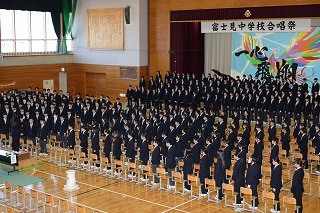 全校で、富士見町の町政70周年を祝う歌「空の恵みが届く町」と校歌を歌った後、2学年、1学年、3学年の順にクラス合唱を行いました。