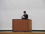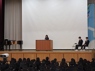 本日から3学期が始まり、生徒たちは寒い中、元気に登校しました。1時間目には始業式があり、各学年の代表生徒が3学期の抱負を発表しました。「学習」、「生徒会」、「高校受験」など、それぞれが頑張りたいことを発表すると、会場は温かい拍手に包まれました。彼らに触発され、自分も頑張るぞと思った生徒も多かったと思います。