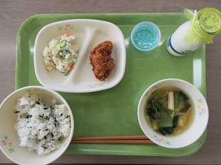 今日は3-2のリクエスト給食です。唐揚げは、唐揚げ用の鶏肉を、にんにく、しょうが、しょうゆ、酒、澱粉、揚げ油で味付けしました。肉の厚さと、あっさりとした味付けがよかったです。このおいしい唐揚げは、すべて長野県産の鶏肉を使用しているとのことで、長野県民であることを誇りに思う一品でした。