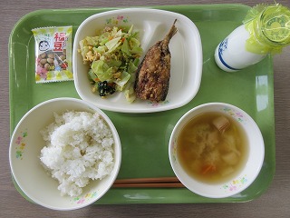 なお、明日は節分ということで、福豆が出ました。今年一年の幸せを願って食べました。また福豆以外にも、節分をイメージしたメニューがあります。何かわかりますか?