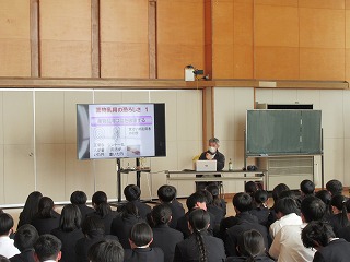 今日は、学校薬剤師の藤澤先生にご来校いただき、2年生に向けて薬物乱用防止講話をしていただきました。