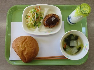 手作りコロッケは、じゃがいも、豚ひき肉、玉ねぎ、にんじん、油、塩、こしょう、ナツメグ、割卵、小麦粉、パン粉、揚げ油、中濃ソースが材料として使われました。じゃがいもがホクホクしており、どんどん食べたくなるコロッケでした。そのまま食べてもおいしかったですが、パンにはさんで食べると、パンの甘さと相まって、また違った魅力を味わうことができました。