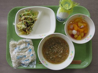 フルーツポンチは、ぶどう、サイダー、シャインマスカット、はちみつレモンの4種類のゼリーに、みかん、甘夏 、ナタデココ、白玉が入っていました。また、シロップは給食室手作りです。多くのクラスのリクエスト給食に選ばれただけあって、甘さや酸っぱさなど、さまざまな味を楽しむことができました。特に、みかんの新鮮な甘さは、くせになる程でした。