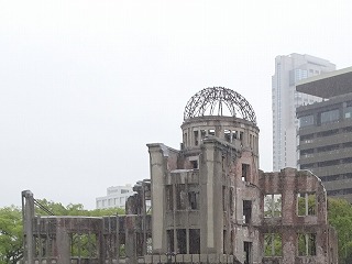 広島はあいにくの雨。傘を差しながら平和記念公園を歩きます。